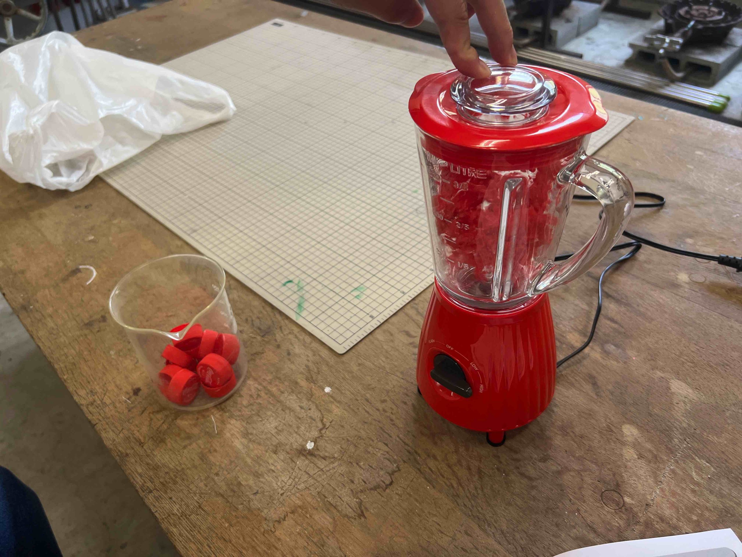 家庭用のミキサーにペットボトルキャップを5個、直接投入して、スイッチを入れ撹拌しました。